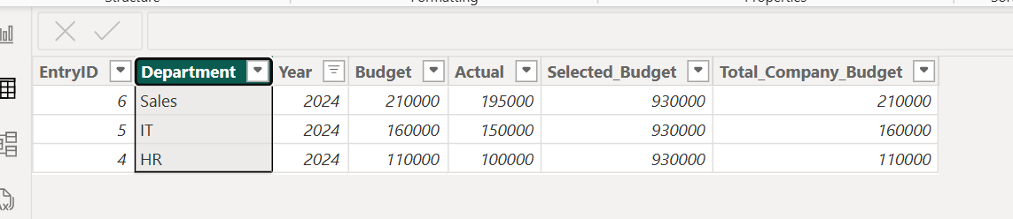 Total_Company_Budget = CALCULATE(SUM(FinanceData[Budget]), REMOVEFILTERS(FinanceData[Department]))