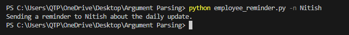The main() function uses sys.argv[1:] to get the arguments passed after the script name. The script expects one option: either -n or –name, followed by the employee’s name. If the argument is missing or invalid, it shows a usage message. If a valid name is provided, it prints a personalized reminder message. To include spaces in the name, wrap the argument in quotes (e.g., –name “Nirnayika Pooja”).