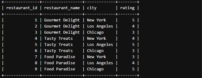 Explanation: Here, the MAX() function acquires the data of ratings of each restaurant per city.