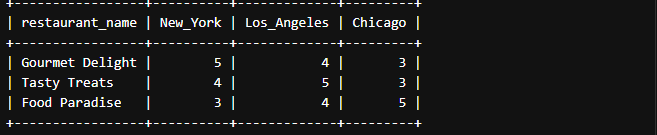 Explanation: Here, the cross-join creates a matrix structure temporarily with cities and restaurants, then CASE with MAX() combines the data into columns, and then GROUP BY displays the table.