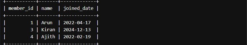 Explanation: Here, the JOIN Statement joined the member ID and member name from the member table, and then the DELETE statement deleted the record of member ID 2 from the table.